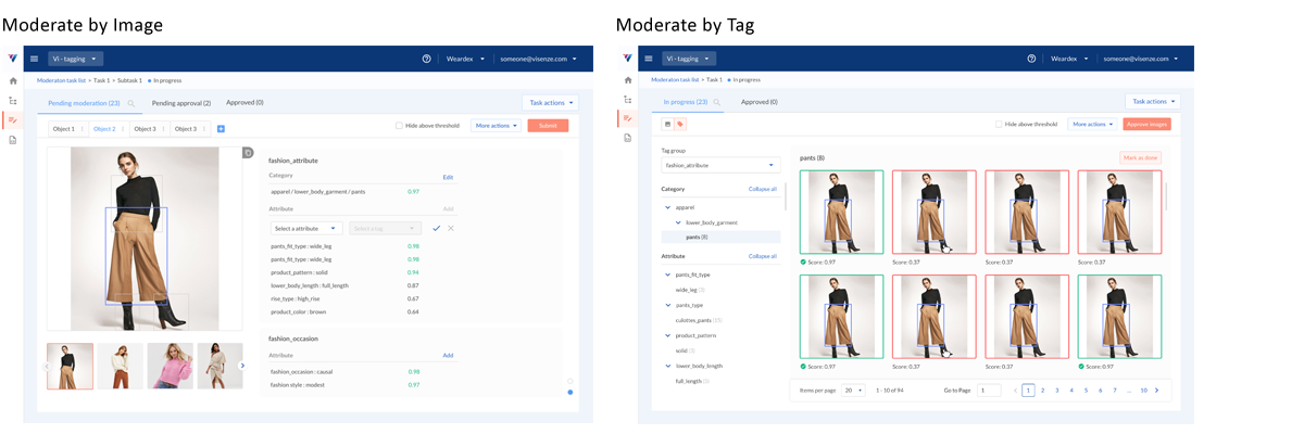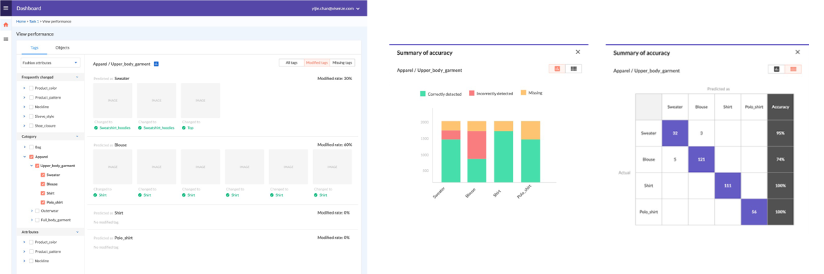 We find a need for a tagging performance report for analysis of tagging accuracy so that the recognition process can be improved. ViSenze can use this result to train and improve the data models and clients are made aware of how the system is performing to confidently approve high-performing keyword tags. (e.g. if 'sweater' has a high accuracy of being detected accurately, moderation administrator will be able to confidently approve images with the 'sweater' tag)
