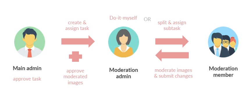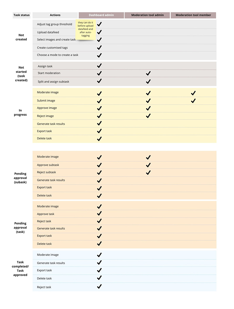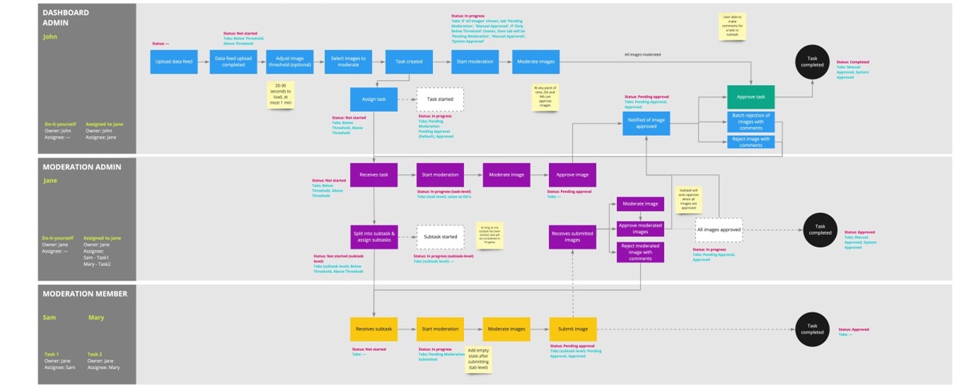 Following, there was a few rounds of interaction with ViSenze's client to understand their current moderation workflow and the different roles involved. Three key roles were identified: