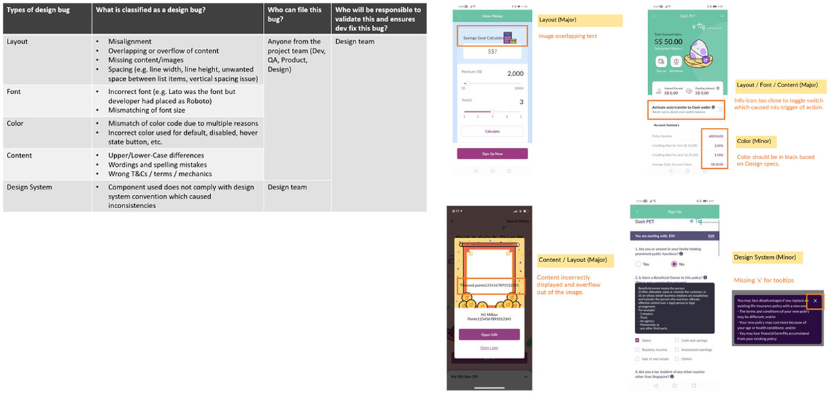 Often, design bugs were also deprioritised as a lower priority bug over functional bugs. This was due to the lack of understanding of what constitutes as a 'design bug' and was mistaken as just aesthetic changes. I came up with a design QC benchmarking framework, along with examples to help the project team understand what is classified as Critical, Major and Minor severity.