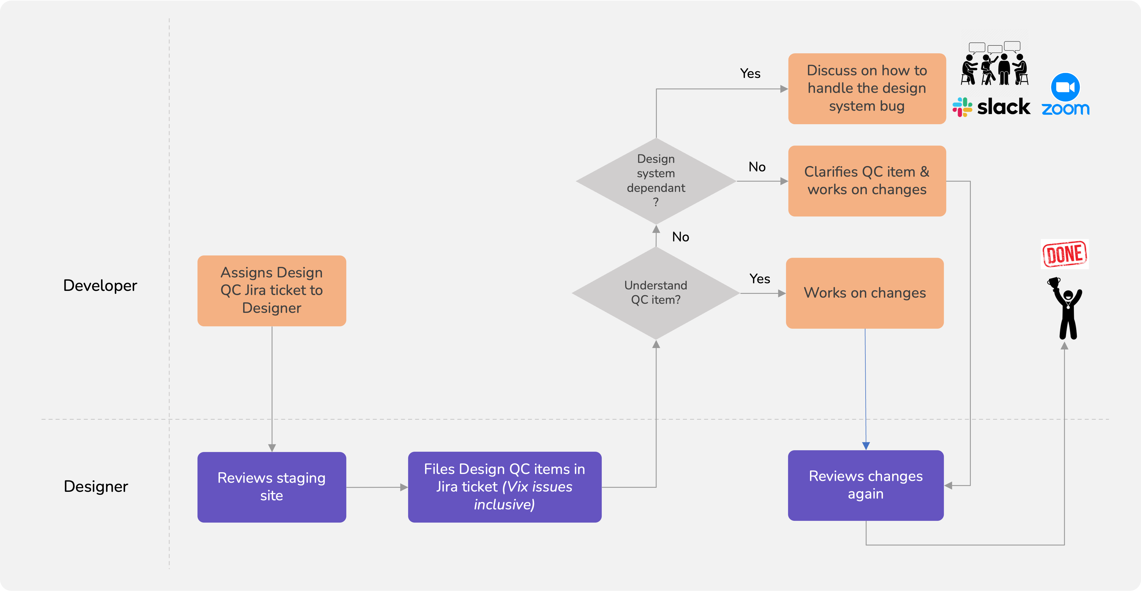 When validating an application, there might be a design system bug found. I came up with this process to help developers and designers know what to do: